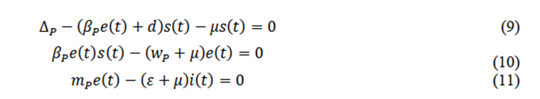 A couple of equilibrium points are determined. The first equilibrium point, PC1, is determined when i=0, which corresponds to the case of a disease-free equilibrium, known as the disease-free point. By imposing this condition on equation we get that e=0 too. Using these values in equation (9), we obtain that