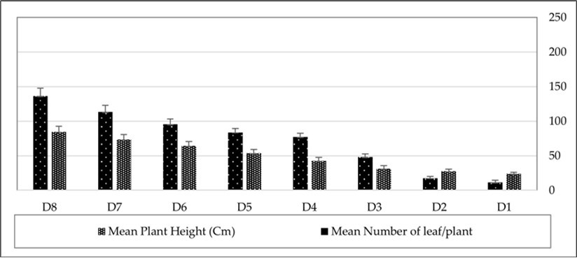 The survey of pepper plant growth in the greenhouse during the November 2023 – March 2024 period demonstrated that the height of the plants increased from 23.66 ± 2.24 cm at the first measurement (one week after planting) to 84.66 ± 7.33 cm by early March 2024. Similarly, the mean number of leaves per plant increased, reaching 136.33 ± 11.42 leaves per plant (Figure 1).