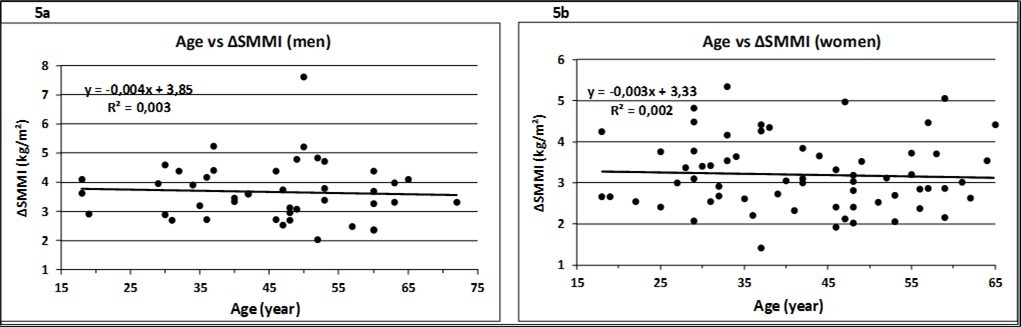 Figure 5.Relation between age and the increase of muscle mass, height adjusted, in men (a) and women (b). The slope of the regression lines was not significantly different from zero (ß = 0, p>0.05).